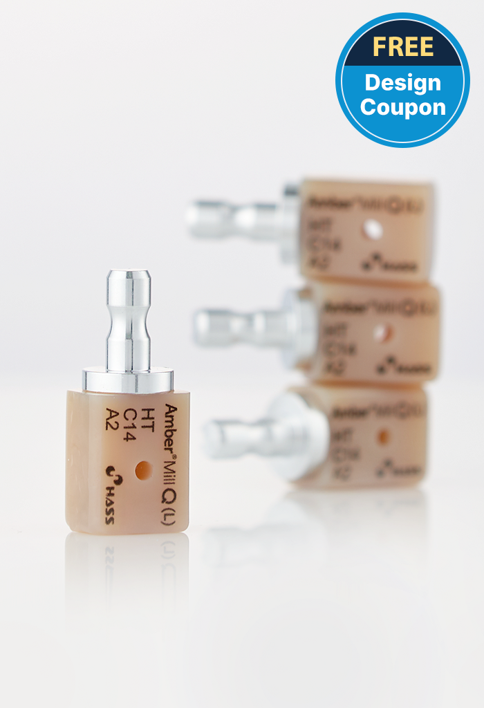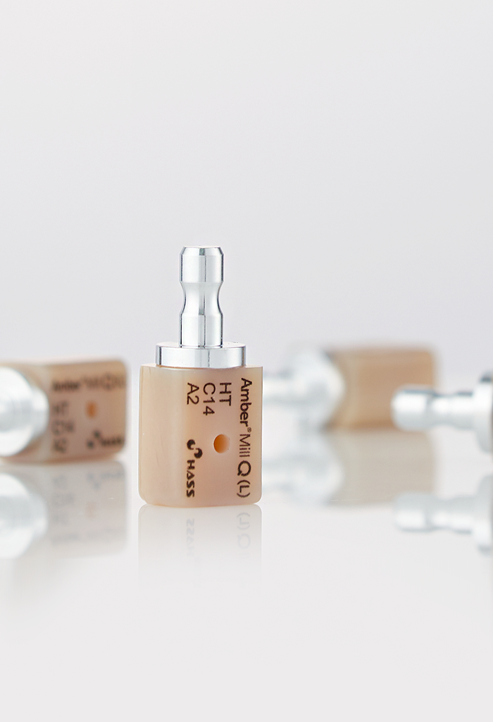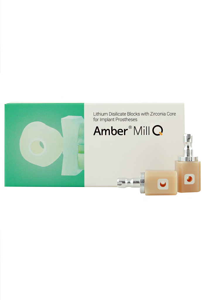 Amber Mill Q supera las limitaciones de los bloques Meso tradicionales mediante la incorporación de una capa de zirconia que enmascara completamente el color metálico del pilar.
