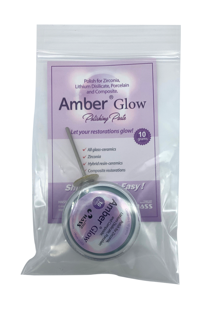 Amber Glow(抛光膏)适用于氧化锆、二硅酸锂、瓷材和复合树脂的抛光。